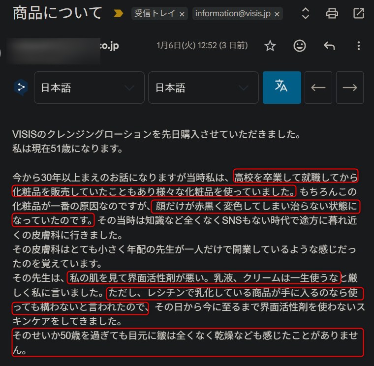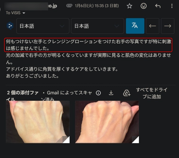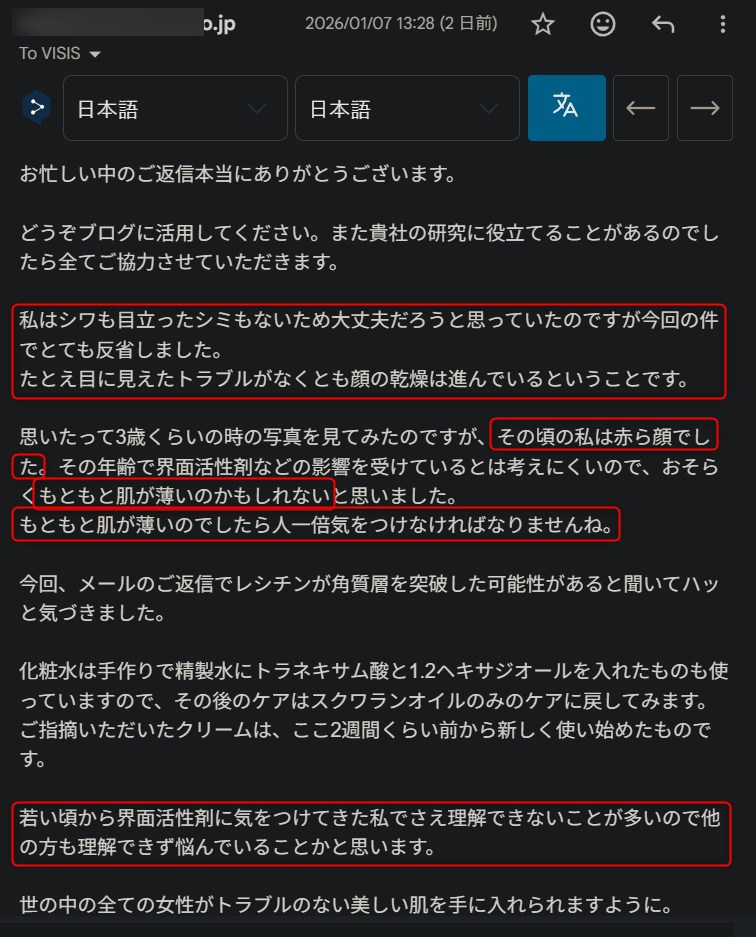 このようなやり取りは、ブランドとしては「商品のトラブル」なので、マイナスとなりますが、僕的には研究者なので、この手の経過は、お客様の美容のヒントになると思い公開しています。